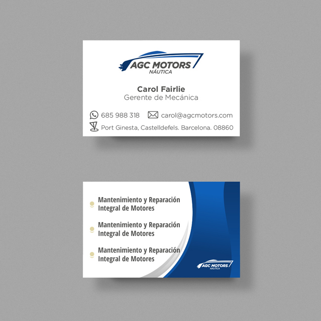 AGC Motors es un taller mecánico especializado en el mundo marino y náutico que necesitaba de diseño de imagen corporativa. Se abstrayó parte de la forma de una embarcación, resaltando la cola de motor, pieza en la que se especializa esta empresa. En cuanto a la tipografía, se elige una fuente gruesa y con bastante presencia, característica que ayuda a transmitir firmeza.